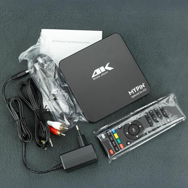 Nowy odtwarzacz multimedialny Mypin obsługujący rozdzielczość 4K. W zestawie znajduje się pilot oraz kabel HDMI. ...